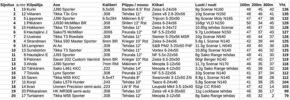 Muutaman peruutuksen jälkeen ampujia oli paikalla 20. Suuret kiitokset jälleen kaikille paikalle tulleille.