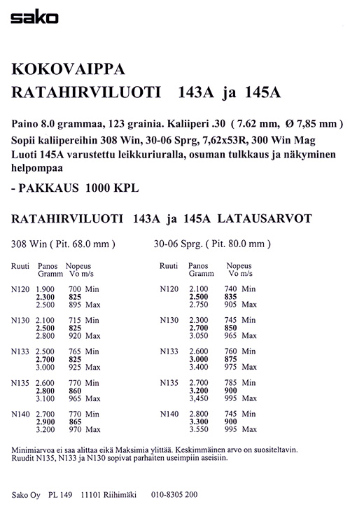 Mä oon ladannu noita 145A ja 143A luoteja N133 ruudilla. Aluksi latasin 67mm pituuteen kun ei Sakon luodille löytynyt latausdataa, niin käytin Lapuan 8g fmj luodin latausdataa olettaen ettei niissä nii paljoa oo eroa. Oli sitten kuitenkin. Meinas hylsyn kannat karata ulosvetäjien kohdilta.
