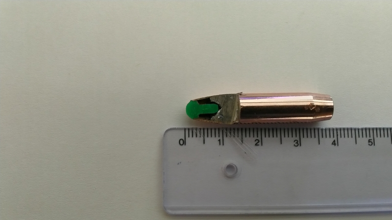 Asettelu on hassu koska kännykän kamera piti tuoda luodin kärjen päälle ettei kuva vääristy. Vaippa on n. 0.3mm paksu ja kärkionteloa on vaipan reunasta mitattuna n. 4mm täysimittaisena ja n. 7.5mm ontelon pohjaan. Mittaukset tönärillä. Kärkiontelon näennäinen epäsymmetrisyys johtuu lyijyn liiskaantumisesta leikattaessa.