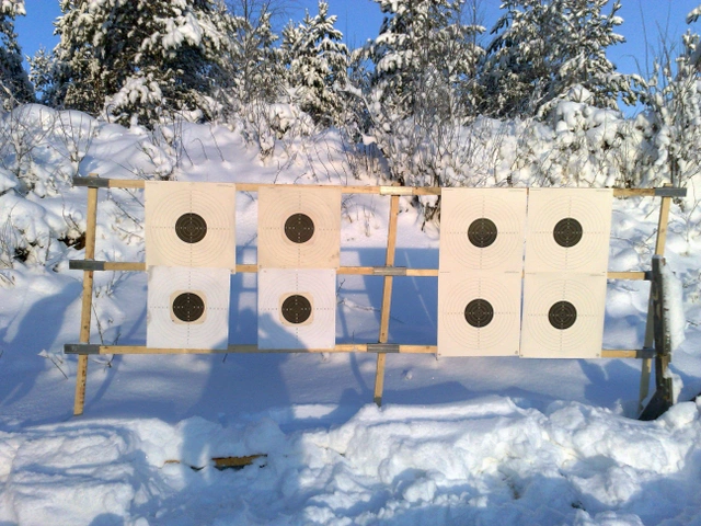 Tauluteline syntyy siten, että tökätään/hierretään halkaistu lauta muutamia senttejä maan/polannelumen sisään ratakiskon kohdalla ja sidotaan lauta ratakiskoon rautalangalla. Näin asetellaan riittävä määrä lautoja pystyyn ja niihin sitten naitetaan taulupahvit kiinni. Olen koonnut aikamoisia purjeita (3x2 pahvia) eikä tuuli ole vielä kaatanut rakennelmaa.